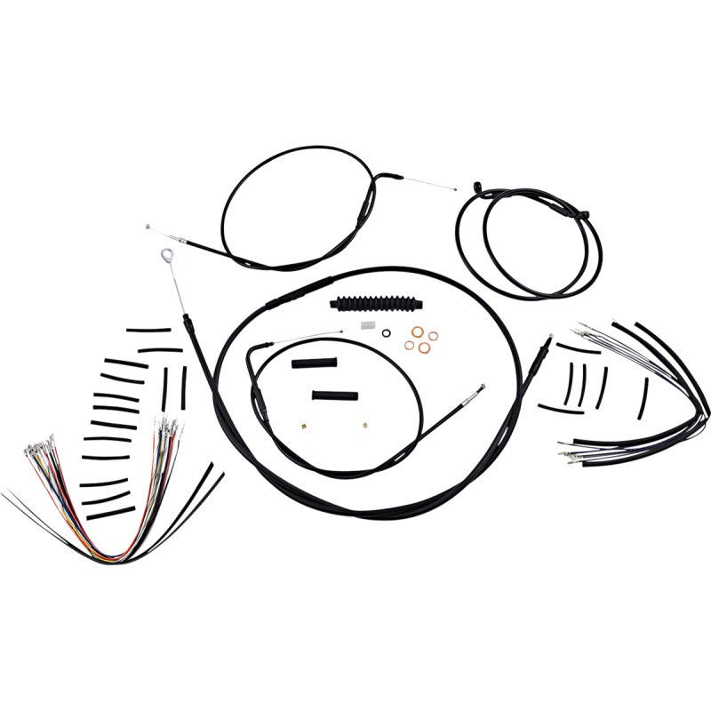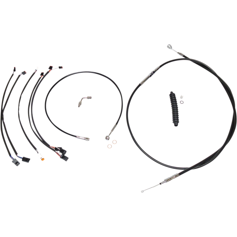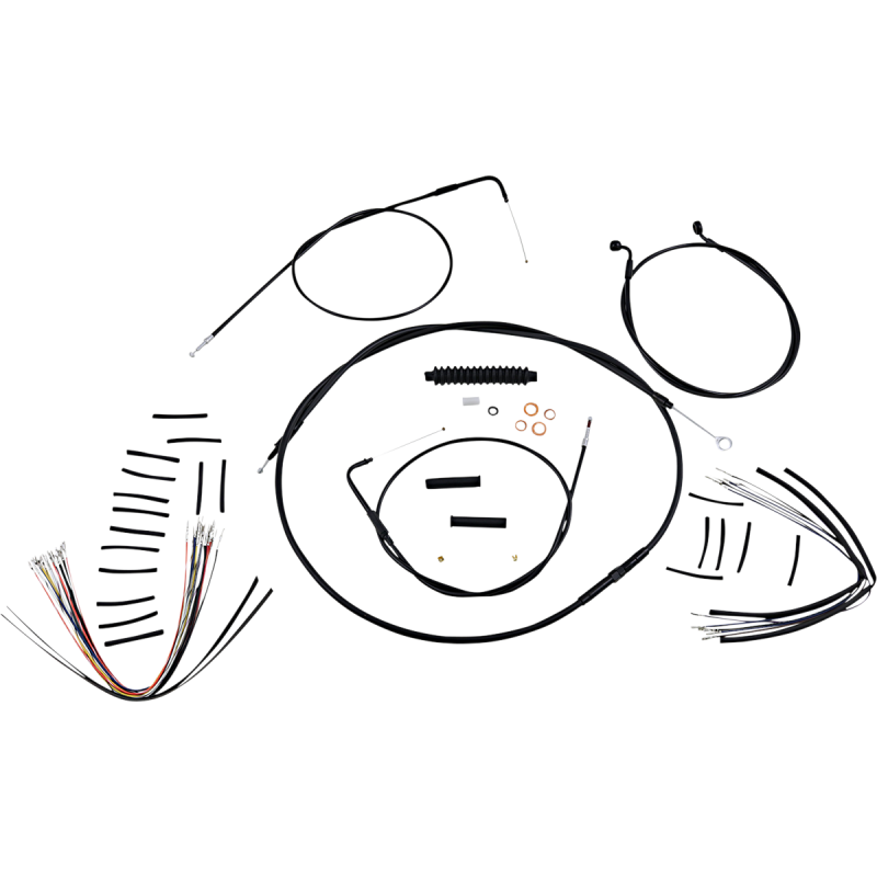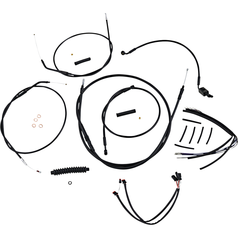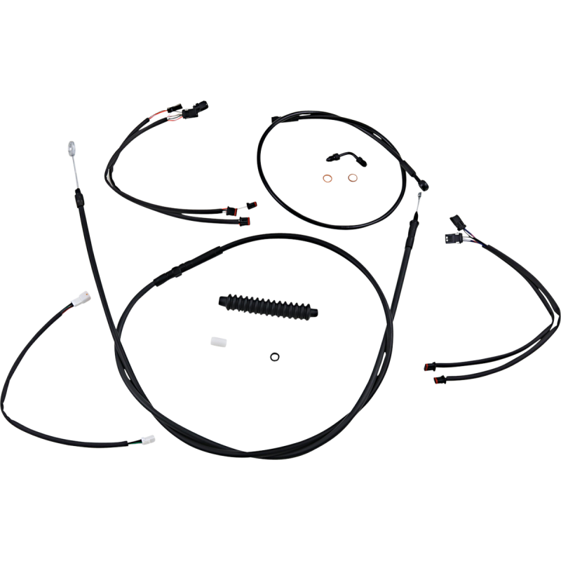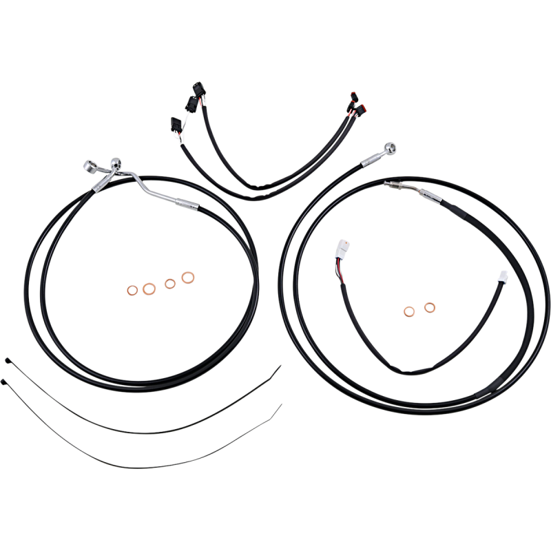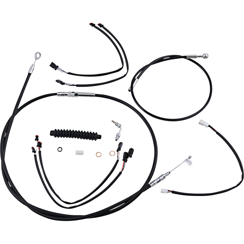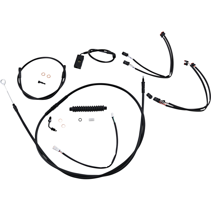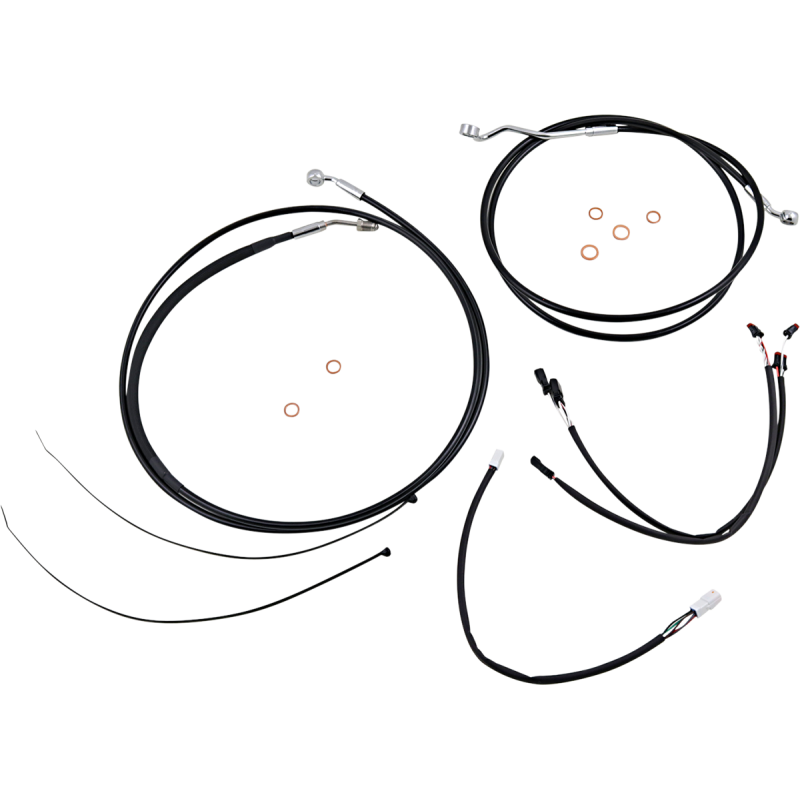Kits include throttle and idle cables or fully terminated throttle-by-wire extensions, clutch cable or hydraulic clutch line, XR DOT brake lines, copper crush washers, hardware, and fully terminated turn signal and switch wiring extensions
