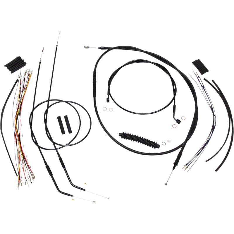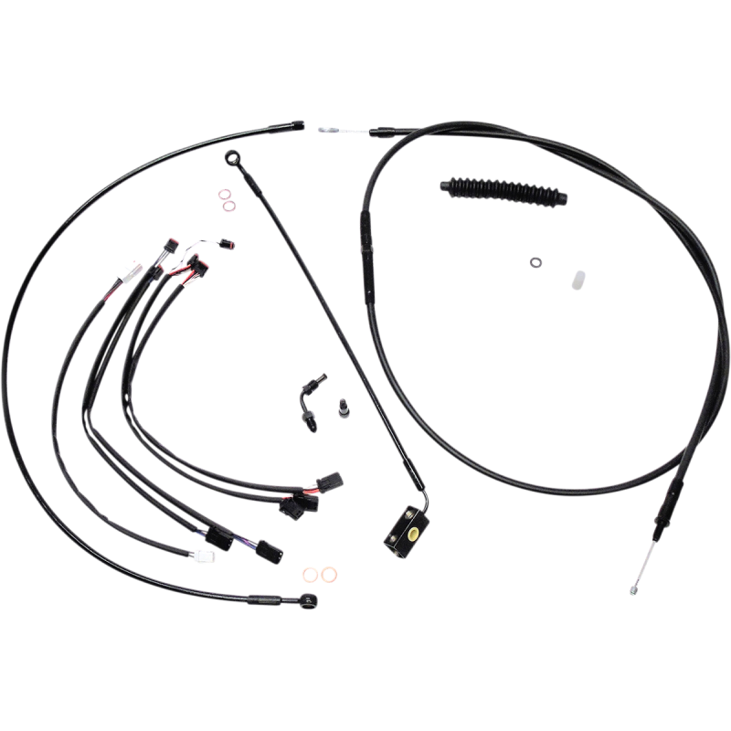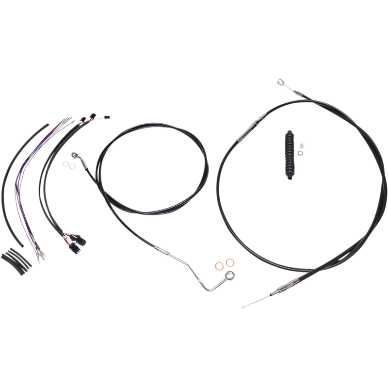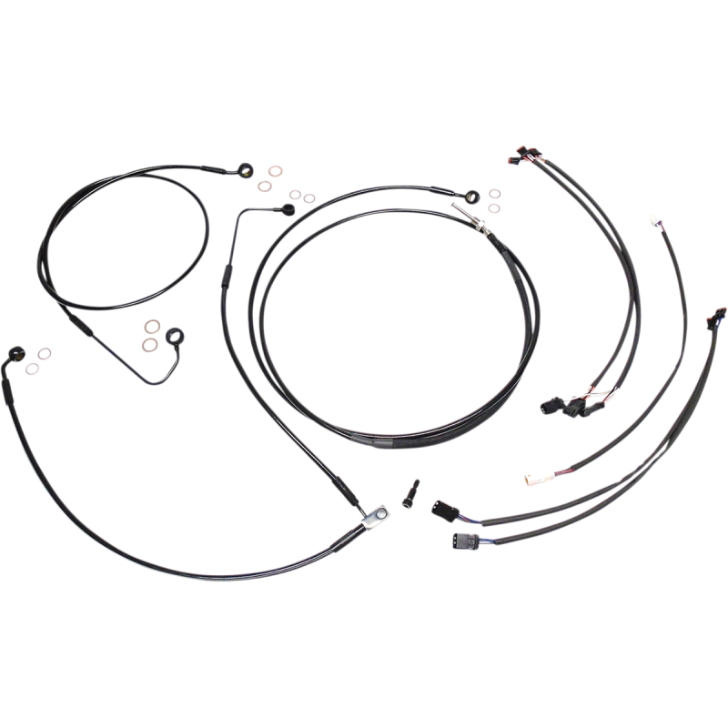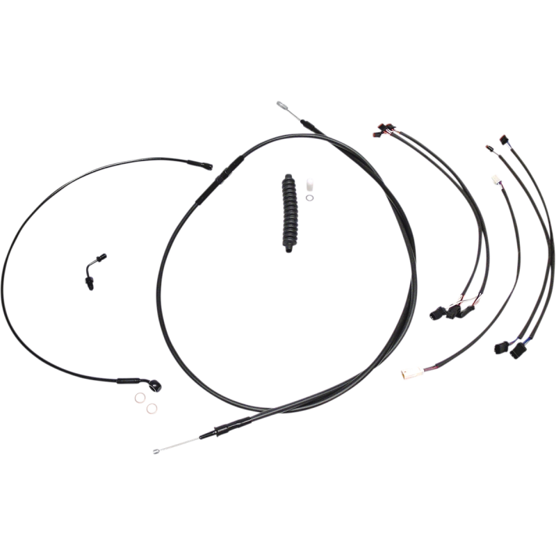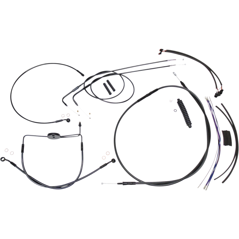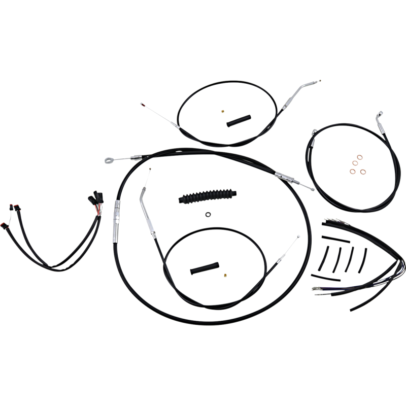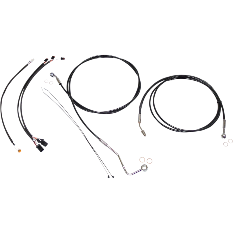 Kits include throttle and idle cables or fully terminated throttle-by-wire extensions, clutch cable or hydraulic clutch line, XR DOT brake lines, copper crush washers, hardware, and fully terminated turn signal and switch wiring extensions