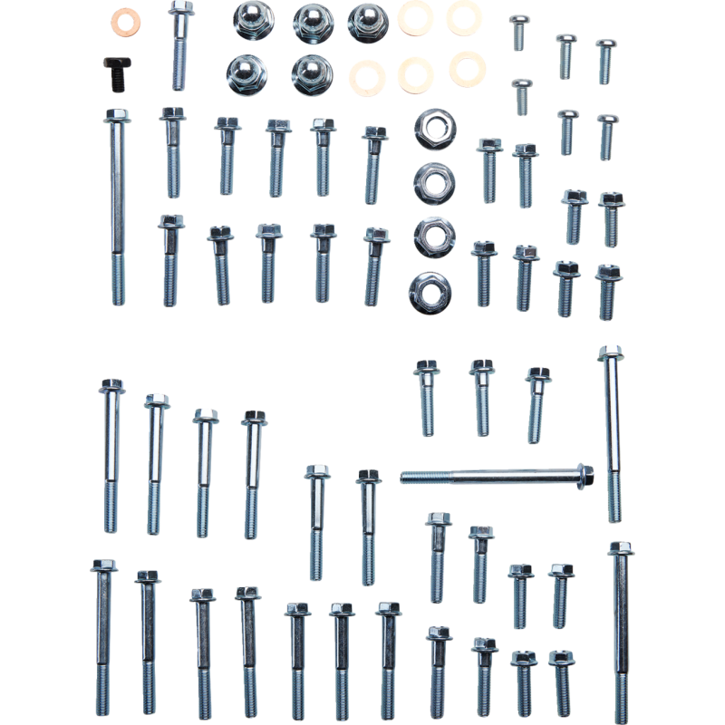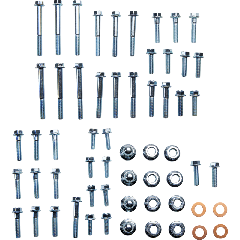 Engine fastener kit comes with modern dimpled flange bolts; with a bright zinc finish, these fasteners last long and give a clean, updated look to any engine